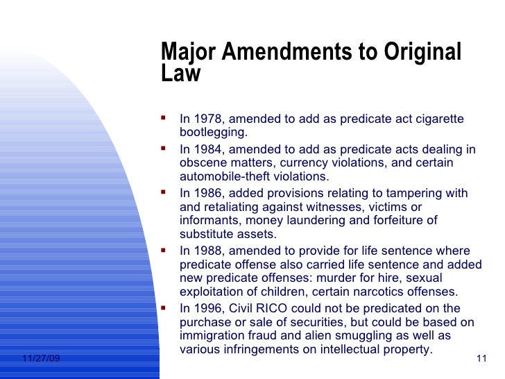 The Racketeering Influenced and Corrupt Organizations Act RICO is a federal law allowing the federal government to place in trusteeship organizations which. The federal Racketeer Influenced and Corrupt Organizations Act RICO 18 USC 1961-1968 prohibits 1 acquiring establishing or operating an enterprise with illegally derived income 2 acquiring or maintaining an interest in or control of an enterprise. Racketeering Law and Legal Definition Racketeering is the federal crime of conspiring to organize to commit crimes especially on an ongoing basis as part of an organized crime operation.